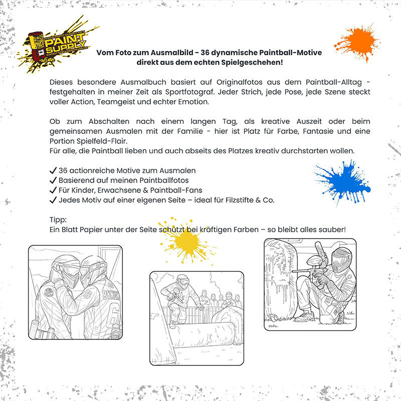 36 echte Paintball-Szenen, aufgenommen vom Sportfotografen Sebastian Prante, wurden in detailreiche Ausmalmotive verwandelt. Jede Seite steckt voller Action, Teamgeist und Farbe – perfekt zum Entspannen, Abschalten und Kreativsein.