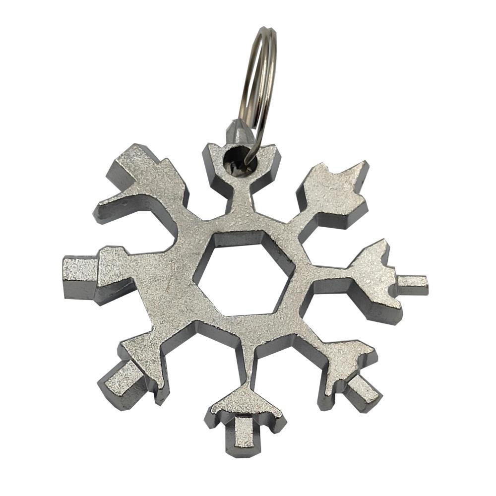 Trotz des handlichen Formats bietet das Multitool insgesamt 17 Funktionen. Dazu gehören acht Schraubenschlüsseleinsätze, sechs verschiedene Inbusgrößen, ein Kreuzschraubendreher, ein Schlitzschraubendreher sowie ein integrierter Flaschenöffner. Damit eignet sich das Tool ideal für schnelle Einsätze am Bike, Skateboard, Roller, im Haushalt oder auf Tour.