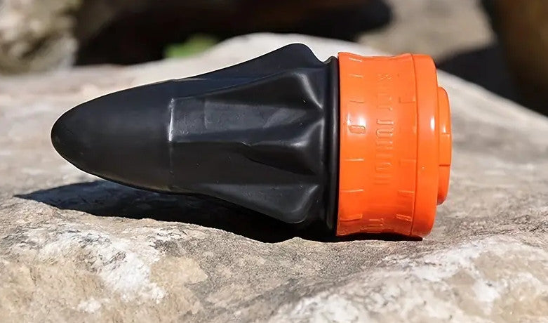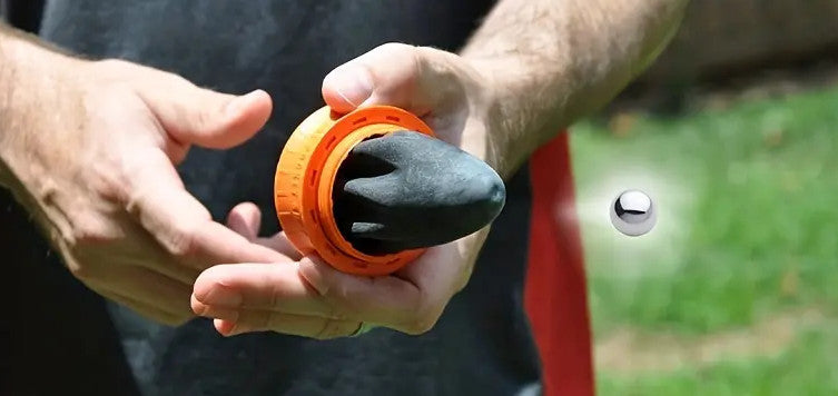 Der sehr stabile Gummisack ist an einem breiten und gut in der Hand liegenden Kunststoffring befestigt. Munition in den Gummi-Sack, auf Spannung ziehen und den Sack loslassen. Schwups ... schon ist die Munition unterwegs in Richtung Ziel.
