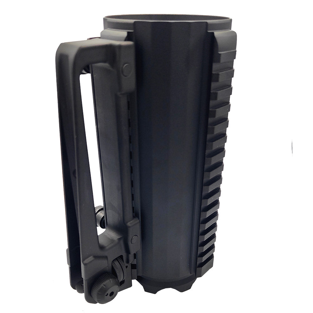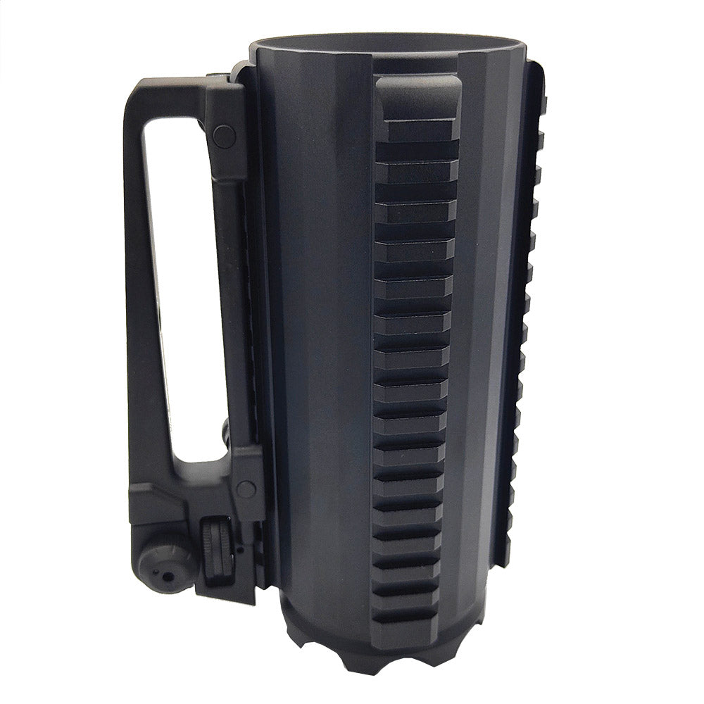 Der taktische Becher hat an drei Seiten taktisches Rails verbaut. An der rechten Rail ist ein Carey Handle im M16-Style als Becher-Griff montiert. Der Boden ist verschraubt und hat einen Glasbrecherkranz als Fuß.